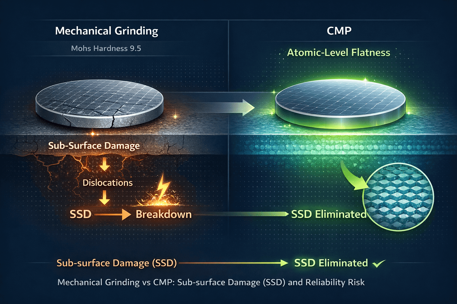 సెమీకండక్టర్లలో పనితీరు లీపు తరచుగా ప్రాసెసింగ్ ఖచ్చితత్వం ద్వారా థ్రోటిల్ చేయబడుతుంది. 9.5 మొహ్స్ కాఠిన్యంతో, SiC యంత్రం చేయడం చాలా కష్టం. సాంప్రదాయిక యాంత్రిక గ్రౌండింగ్ తరచుగా "దాచిన మచ్చలు"-సబ్-సర్ఫేస్ డ్యామేజ్ (SSD)ని వదిలివేస్తుంది-ఇది తదుపరి ఎపిటాక్సియల్ (ఎపి) పెరుగుదల సమయంలో డిస్లోకేషన్లుగా ప్రచారం చేయబడుతుంది, చివరికి అధిక వోల్టేజ్లో విపత్తు పరికరం విచ్ఛిన్నానికి దారితీస్తుంది.