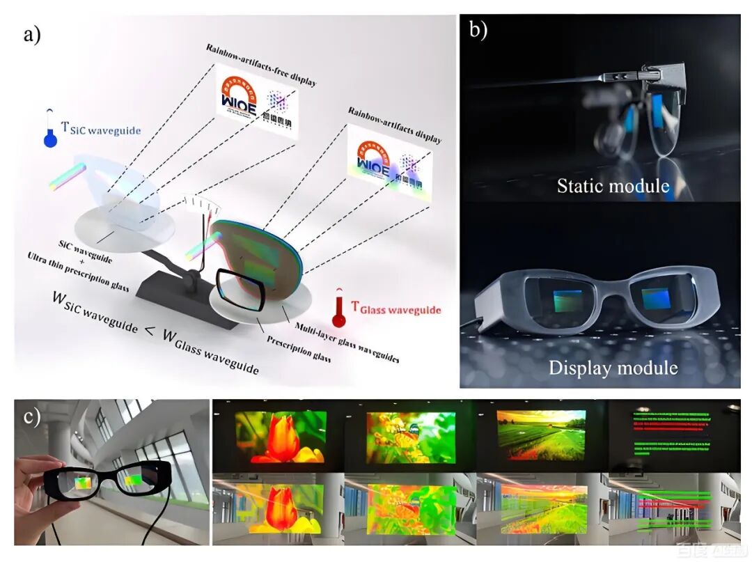 సింగిల్-క్రిస్టల్ సిలికాన్ కార్బైడ్ (SiC) అద్భుతమైన పారదర్శకతతో కనిపించే కాంతి వర్ణపటంలో సుమారు 2.6 వక్రీభవన సూచికను కలిగి ఉంది, ఇది హై-ఇంటిగ్రేటెడ్ ఆప్టికల్ వేవ్గైడ్ డిజైన్లకు అనుకూలంగా ఉంటుంది. దాని అధిక వక్రీభవన సూచిక లక్షణాల ఆధారంగా, ఒకే-పొర SiC డిఫ్రాక్షన్ వేవ్గైడ్ సిద్ధాంతపరంగా దాదాపు 70° వీక్షణ క్షేత్రాన్ని (FOV) సాధించగలదు మరియు ఇంద్రధనస్సు నమూనాలను సమర్థవంతంగా అణిచివేస్తుంది. అంతేకాకుండా, SiC చాలా అధిక ఉష్ణ వాహకతను కలిగి ఉంది (సుమారు 4.9 W/cm·K), ఇది ఆప్టికల్ మరియు మెకానికల్ మూలాల నుండి వేడిని వేగంగా వెదజల్లడానికి అనుమతిస్తుంది, ఉష్ణోగ్రత పెరుగుదల కారణంగా ఆప్టికల్ పనితీరు క్షీణతను నివారిస్తుంది. అదనంగా, SiC యొక్క అధిక కాఠిన్యం మరియు దుస్తులు నిరోధకత వేవ్గైడ్ లెన్స్ల నిర్మాణ స్థిరత్వం మరియు దీర్ఘకాలిక మన్నికను గణనీయంగా పెంచుతుంది. SiC పొరలను మైక్రో/నానో ప్రాసెసింగ్ (ఎచింగ్ మరియు పూత వంటివి) కోసం ఉపయోగించవచ్చు, మైక్రో-ఆప్టికల్ నిర్మాణాల ఏకీకరణను సులభతరం చేస్తుంది.