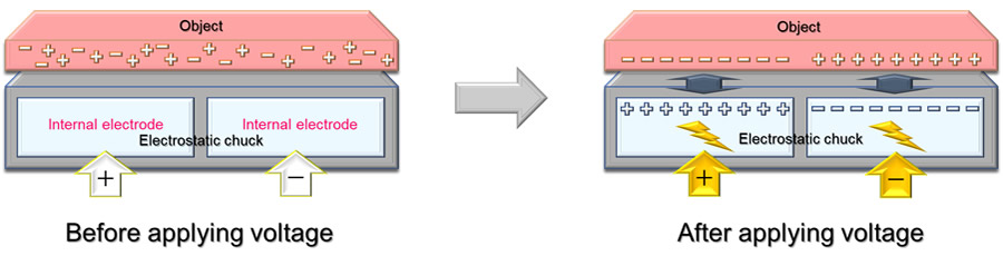 ఎలెక్ట్రోస్టాటిక్ చక్ (ESC) అనేది ఒక ప్రత్యేకమైన చక్, ఇది వస్తువులను పట్టుకోవటానికి, నొక్కడానికి మరియు తీయటానికి ఎలెక్ట్రోస్టాటిక్ శక్తిని ఉపయోగిస్తుంది (వర్క్పీస్). ఏదైనా పదార్థం నగ్న కంటికి కనిపించని సానుకూల మరియు ప్రతికూల ఛార్జీలను కలిగి ఉంటుంది. పదార్థం ESC పై ఉంచినప్పుడు మరియు ESC యొక్క అంతర్గత ఎలక్ట్రోడ్లకు బైపోలార్ వోల్టేజ్ వర్తించబడినప్పుడు, ESC యొక్క అంతర్గత ఎలక్ట్రోడ్ల ధ్రువణతకు సరిపోయేలా సానుకూల మరియు ప్రతికూల ఛార్జీలు పదార్థంలో కదులుతాయి. ESC మరియు పదార్థం మధ్య ఈ ఆకర్షణను ఎలెక్ట్రోస్టాటిక్ ఫోర్స్ అని పిలుస్తారు మరియు ఇది మా చక్స్ వెనుక ఉన్న ప్రాథమిక సూత్రం.
